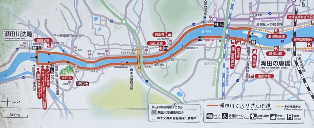 向かって左側が瀬田川洗堰、右側が瀬田の唐橋で、川沿いをぐるりと回れるようです。