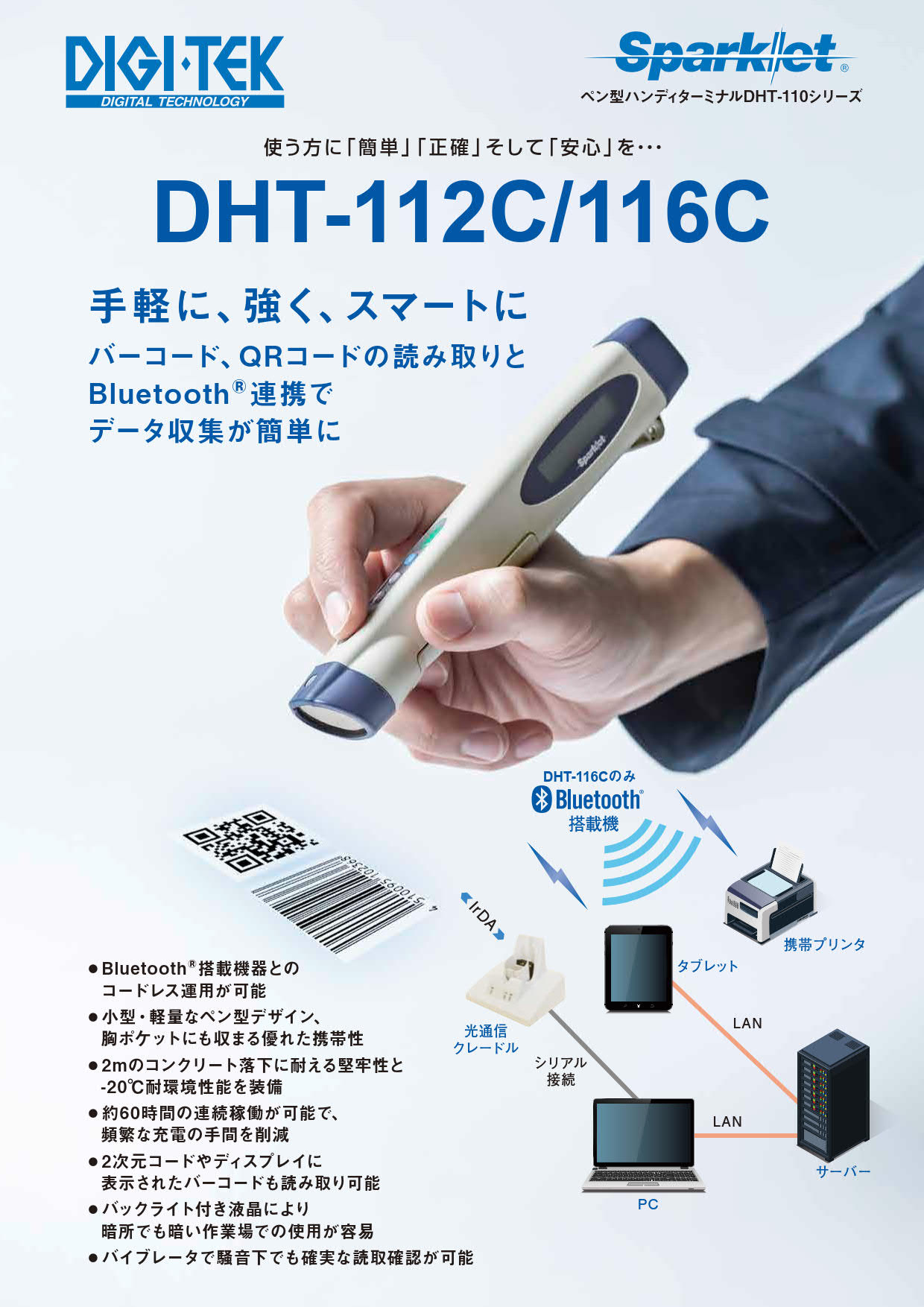 2mのコンクリート落下にも耐える落下強度、JIS防沫準拠防水機能を備え、温度性能についても-20℃まで使用可能です。